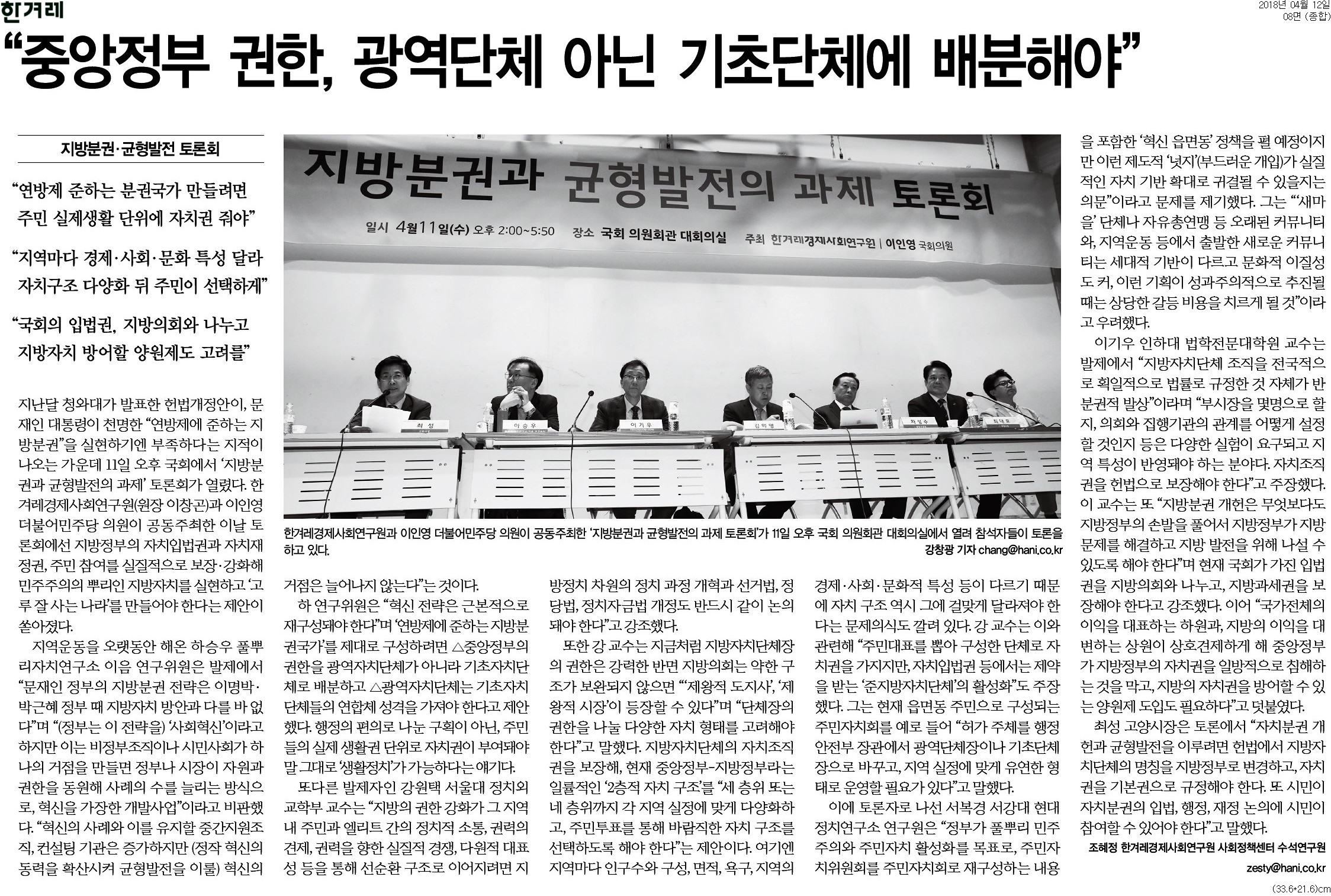 "중앙정부 권한, 광역단체 아닌 기초단체에 배분해야"(18/04/12)