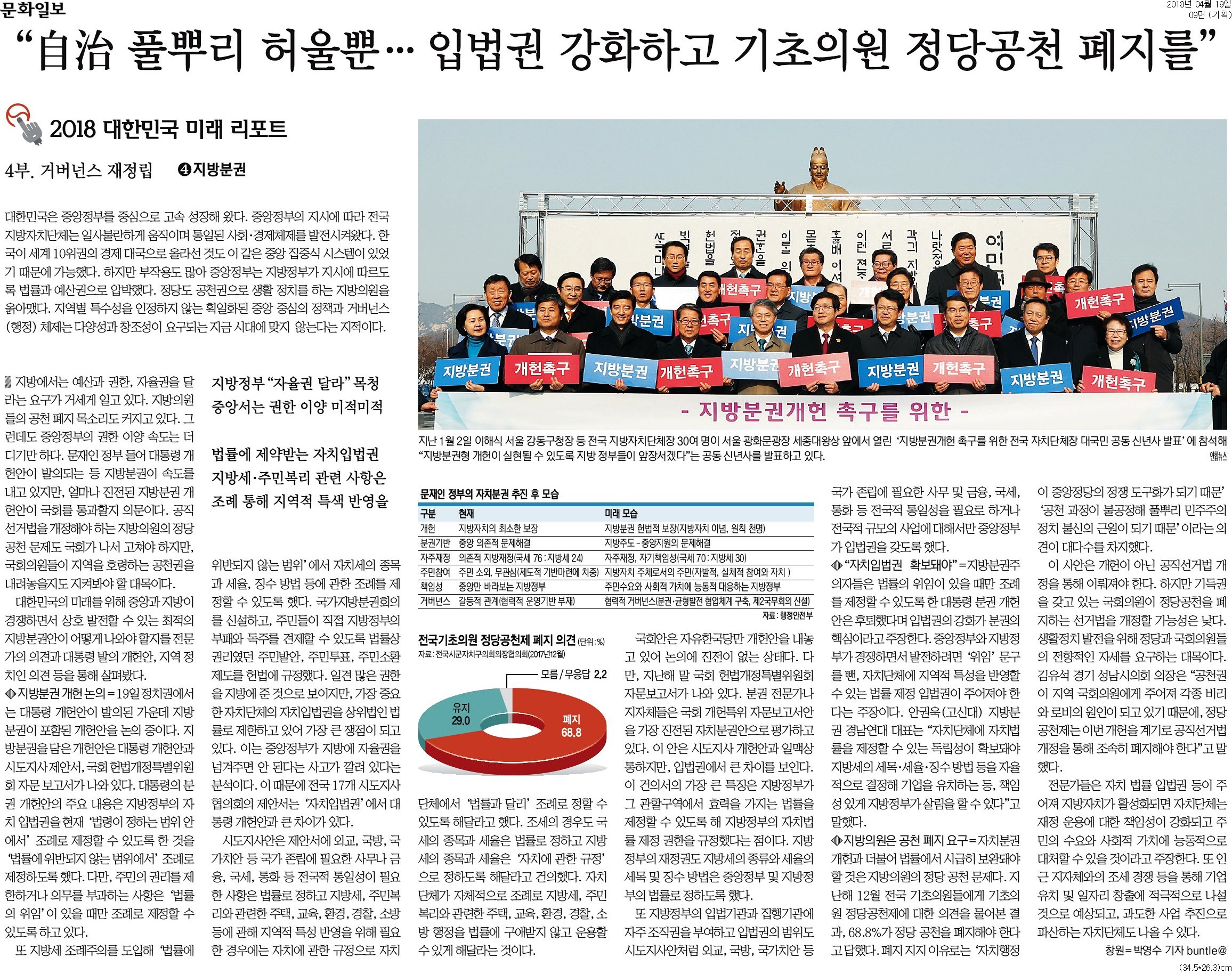 "自治 풀뿌리 허울뿐··· 입법권 강화하고 기초의원 정당공천 폐지를"(18/04/19)